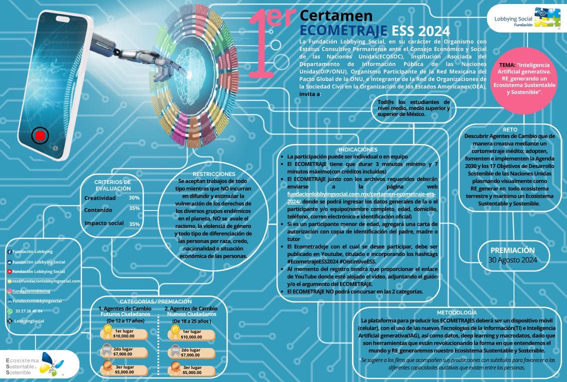 El ECOMETRAJE junto con los archivos requeridos deberán enviarse a la página web fundacionlobbyingsocial.com/certamen-ecometraje-ess-2024/ donde se podrá ingresar los datos generales de la o el participante y/o equipo(nombre completo, edad, domicilio, teléfono, correo electrónico e identificación oficial)